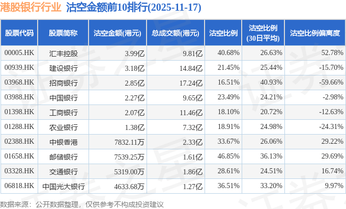从沽空金额来看,汇丰控股、建设银行、招商银行沽空金额位居行业前三,分别为3.99亿港元、3.18亿港元、2.85亿港元。