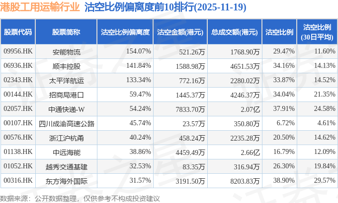 从沽空金额来看,中通快递-W、中远海控、中远海能沽空金额位居行业前三,分别为7833.7万港元、4890.87万港元、4459.49万港元。