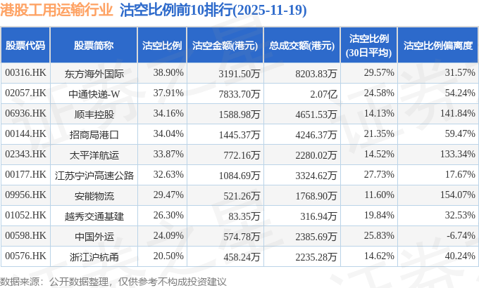 从沽空比例来看,东方海外国际、中通快递-W、顺丰控股沽空比例位居行业前三,分别为38.9%、37.91%、34.16%。