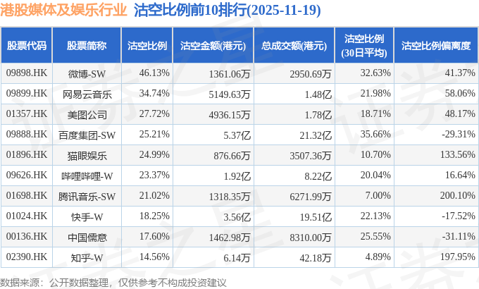 从沽空比例来看,微博-SW、网易云音乐、美图公司沽空比例位居行业前三,分别为46.13%、34.74%、27.72%。
