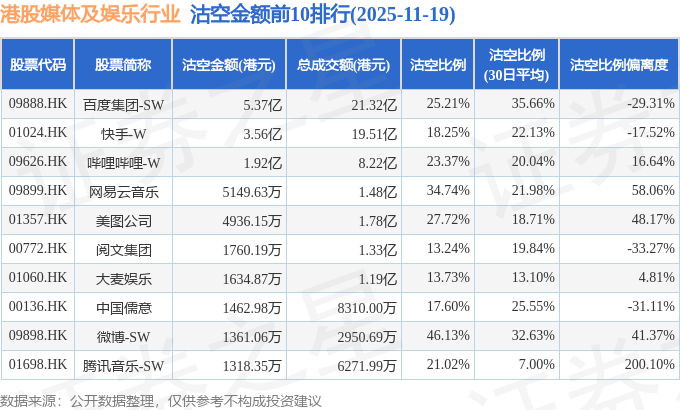 从沽空金额来看,百度集团-SW、快手-W、哔哩哔哩-W沽空金额位居行业前三,分别为5.37亿港元、3.56亿港元、1.92亿港元。
