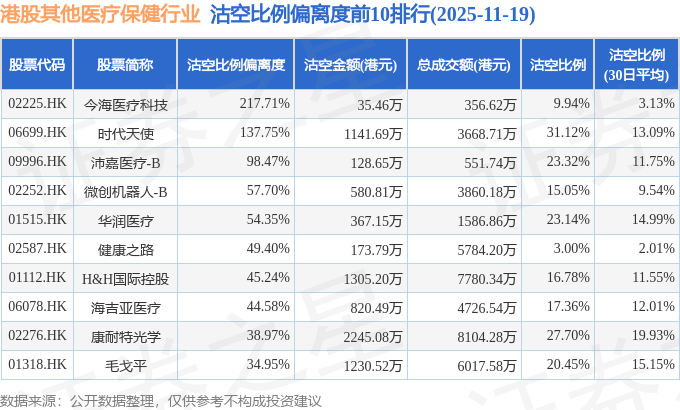 从沽空比例偏离度来看,今海医疗科技、时代天使、沛嘉医疗-B沽空比例偏离度位居行业前三,分别为217.71%、137.75%、98.47%。