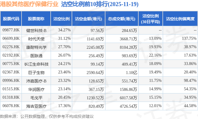 从沽空比例来看,健世科技-B、时代天使、康耐特光学沽空比例位居行业前三,分别为34.27%、31.12%、27.7%。