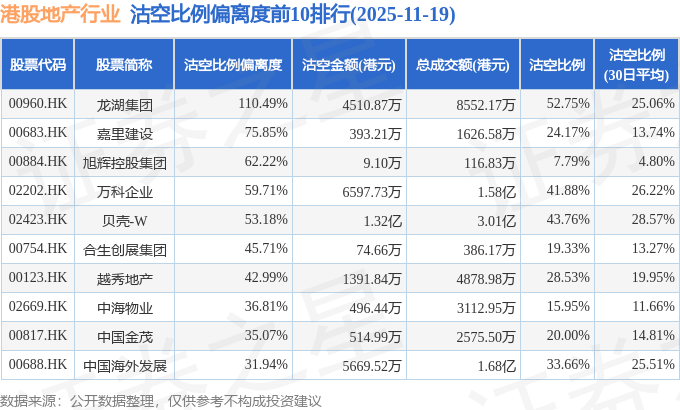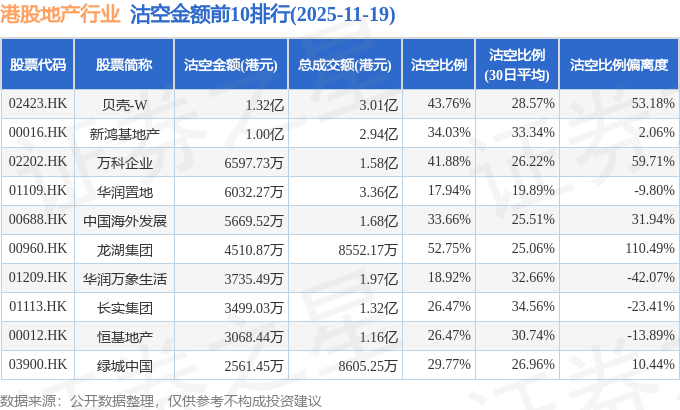从沽空金额来看,贝壳-W、新鸿基地产、万科企业沽空金额位居行业前三,分别为1.32亿港元、1亿港元、6597.73万港元。