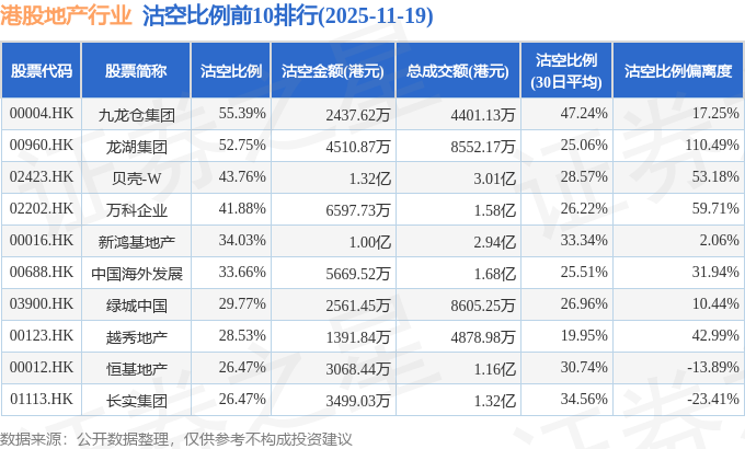 从沽空比例来看,九龙仓集团、龙湖集团、贝壳-W沽空比例位居行业前三,分别为55.39%、52.75%、43.76%。