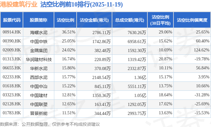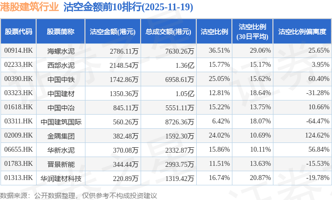 从沽空金额来看,海螺水泥、西部水泥、中国中铁沽空金额位居行业前三,分别为2786.11万港元、2148.54万港元、1742.86万港元。