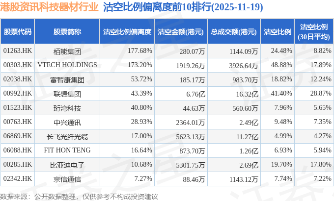 从沽空比例偏离度来看,栢能集团、VTECH HOLDINGS、富智康集团沽空比例偏离度位居行业前三,分别为177.68%、173.2%、53.72%。