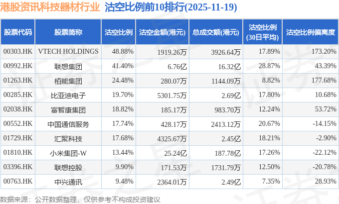 从沽空比例来看,VTECH HOLDINGS、联想集团、栢能集团沽空比例位居行业前三,分别为48.88%、41.4%、24.48%。