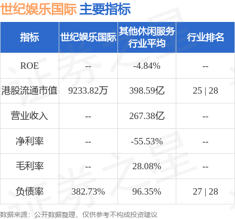 世纪娱乐国际港股市值9233.82万港元,在其他休闲服务行业中排名第25。主要指标见下表: