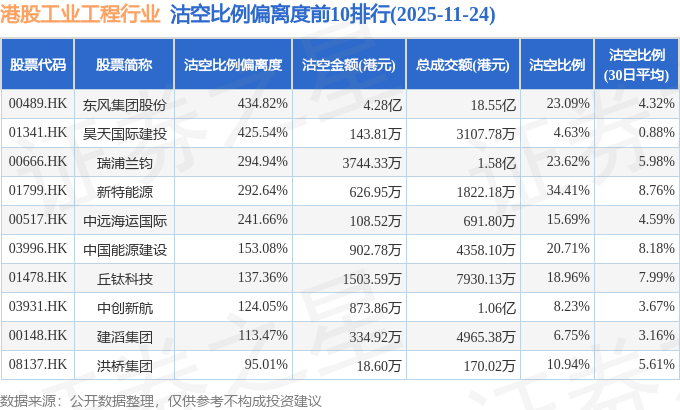 从沽空比例偏离度来看,东风集团股份、昊天国际建投、瑞浦兰钧沽空比例偏离度位居行业前三,分别为434.82%、425.54%、294.94%。