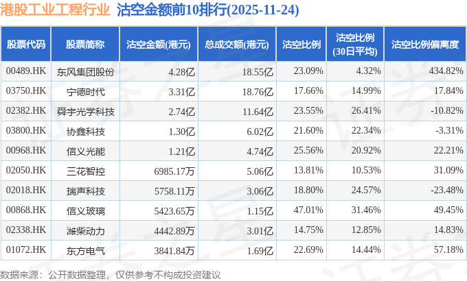 从沽空金额来看,东风集团股份、宁德时代、舜宇光学科技沽空金额位居行业前三,分别为4.28亿港元、3.31亿港元、2.74亿港元。
