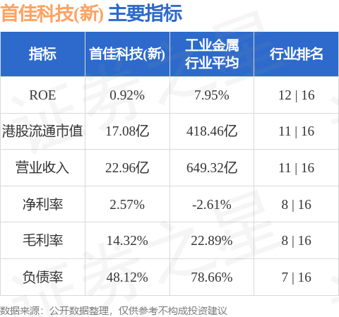 首佳科技(新)港股市值17.08亿港元,在工业金属行业中排名第11。主要指标见下表: