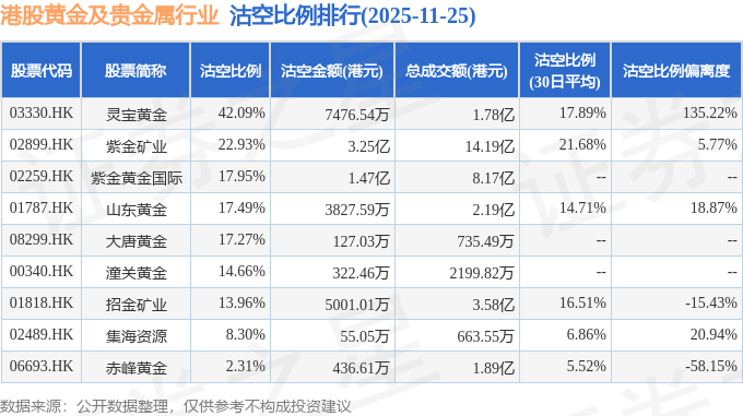 从沽空比例来看,灵宝黄金、紫金矿业、紫金黄金国际沽空比例位居行业前三,分别为42.09%、22.93%、17.95%。