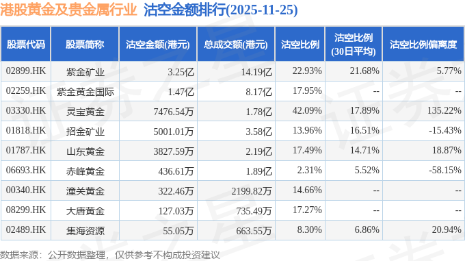 从沽空金额来看,紫金矿业、紫金黄金国际、灵宝黄金沽空金额位居行业前三,分别为3.25亿港元、1.47亿港元、7476.54万港元。