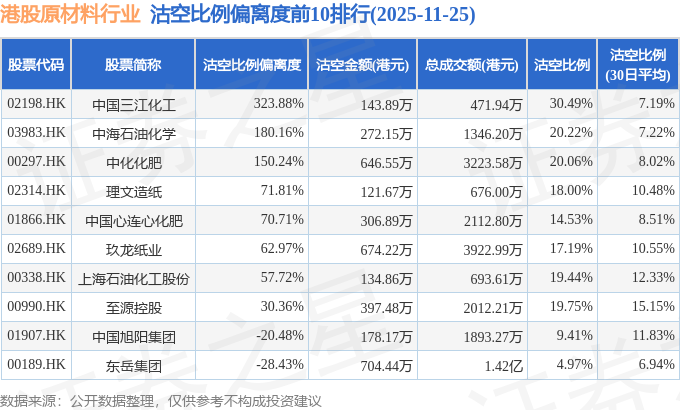 从沽空金额来看,东岳集团、玖龙纸业、中化化肥沽空金额位居行业前三,分别为704.44万港元、674.22万港元、646.55万港元。