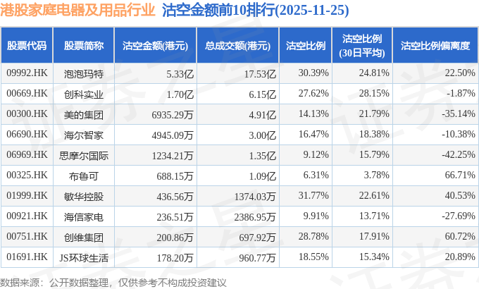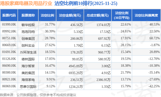 从沽空比例来看,敏华控股、泡泡玛特、创维集团沽空比例位居行业前三,分别为31.77%、30.39%、28.78%。