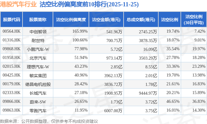 从沽空比例偏离度来看,中创智领、耐世特、小鹏汽车-W沽空比例偏离度位居行业前三,分别为165.99%、100.66%、77.98%。