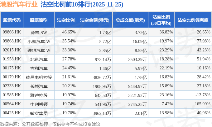 从沽空比例来看,蔚来-SW、小鹏汽车-W、理想汽车-W沽空比例位居行业前三,分别为46.65%、35.54%、33.36%。