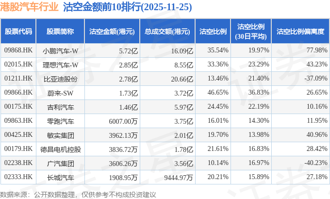 从沽空金额来看,小鹏汽车-W、理想汽车-W、比亚迪股份沽空金额位居行业前三,分别为5.72亿港元、2.85亿港元、2.78亿港元。