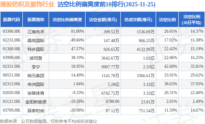 从沽空比例偏离度来看,江南布衣、晶苑国际、特步国际沽空比例偏离度位居行业前三,分别为81%、49.6%、47.57%。