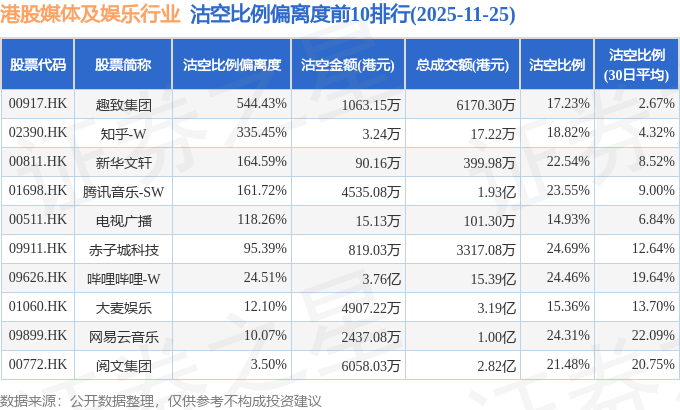 从沽空比例偏离度来看,趣致集团、知乎-W、新华文轩沽空比例偏离度位居行业前三,分别为544.43%、335.45%、164.59%。