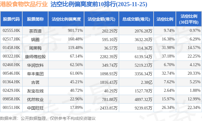 从沽空比例来看,康师傅控股、阜丰集团、周黑鸭沽空比例位居行业前三,分别为37.18%、32.74%、31.98%。