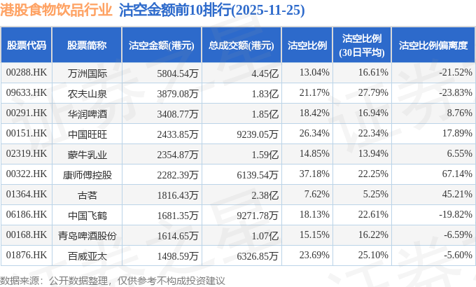 从沽空金额来看,万洲国际、农夫山泉、华润啤酒沽空金额位居行业前三,分别为5804.54万港元、3879.08万港元、3408.77万港元。