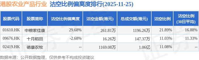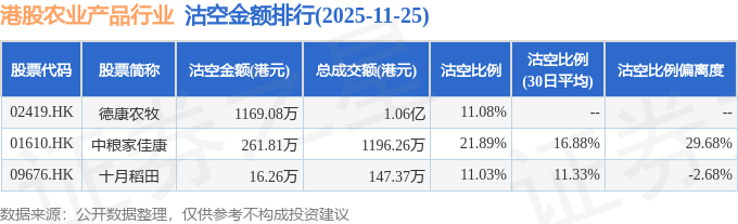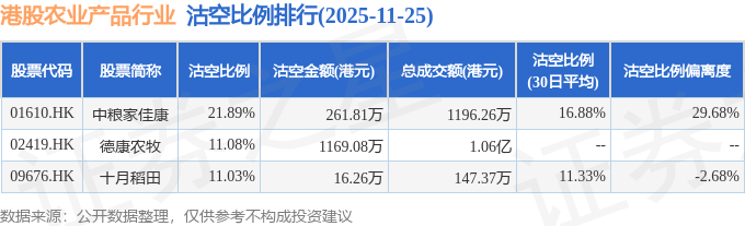 证券之星消息,11月25日港交所披露数据显示,当日港股农业产品行业的21只个股中有3只被沽空,总沽空股数为176.35万股,总沽空金额为1447.15万元(港元),而当日农业产品行业的总成交金额为1.26亿元(港元),沽空比例为11.47%。当日农业产品行业总体涨0.23%。