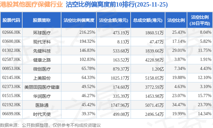 从沽空比例偏离度来看,环球医疗、现代牙科、先健科技沽空比例偏离度位居行业前三,分别为216.25%、194.32%、146.83%。