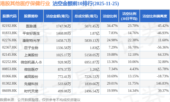 从沽空金额来看,医脉通、平安好医生、康耐特光学沽空金额位居行业前三,分别为1747.96万港元、1468.09万港元、1458.71万港元。