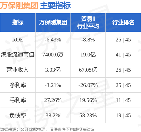 万保刚集团港股市值7400万港元,在贸易Ⅱ行业中排名第41。主要指标见下表: