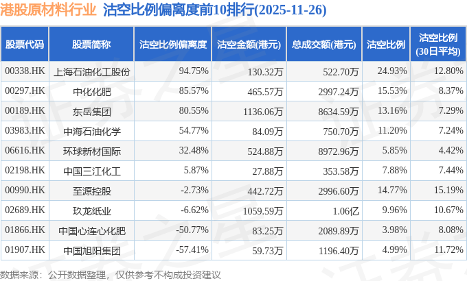 从沽空比例来看,上海石油化工股份、中化化肥、至源控股沽空比例位居行业前三,分别为24.93%、15.53%、14.77%。