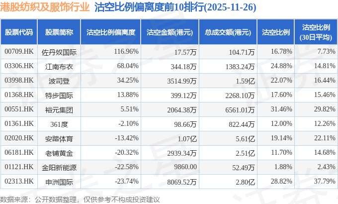 从沽空比例偏离度来看,佐丹奴国际、江南布衣、波司登沽空比例偏离度位居行业前三,分别为116.96%、68.04%、34.25%。