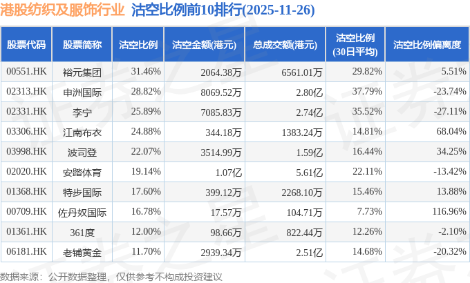 从沽空比例来看,裕元集团、申洲国际、李宁沽空比例位居行业前三,分别为31.46%、28.82%、25.89%。