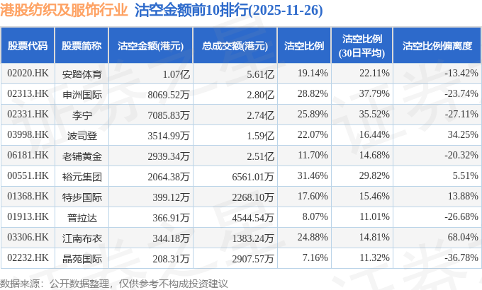 从沽空金额来看,安踏体育、申洲国际、李宁沽空金额位居行业前三,分别为1.07亿港元、8069.52万港元、7085.83万港元。