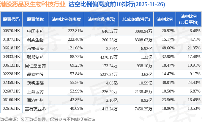 从沽空比例偏离度来看,中国中药、君实生物、京东健康沽空比例偏离度位居行业前三,分别为222.81%、222.4%、121.68%。