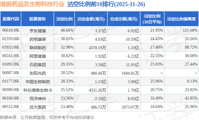 从沽空比例来看,京东健康、药明康德、联邦制药沽空比例位居行业前三,分别为48.66%、38.01%、32.98%。
