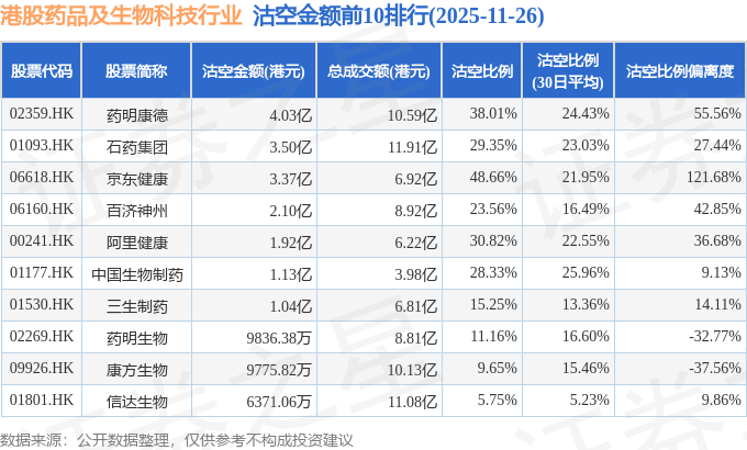 从沽空金额来看,药明康德、石药集团、京东健康沽空金额位居行业前三,分别为4.03亿港元、3.5亿港元、3.37亿港元。