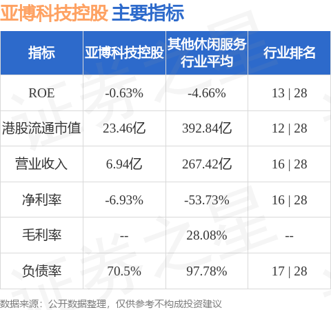 亚博科技控股港股市值23.46亿港元,在其他休闲服务行业中排名第12。主要指标见下表: