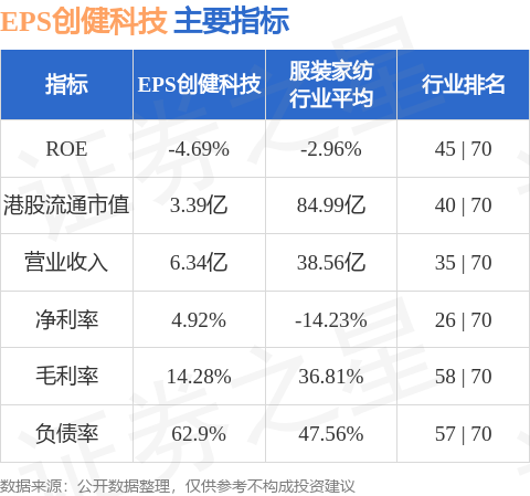 EPS创健科技港股市值3.39亿港元,在服装家纺行业中排名第40。主要指标见下表: