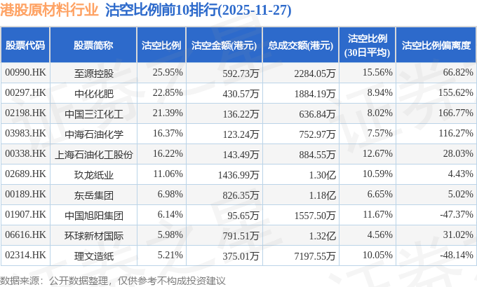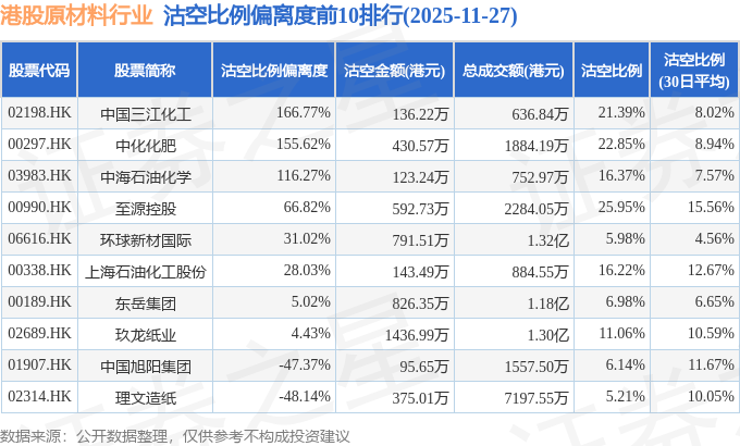 从沽空比例来看,至源控股、中化化肥、中国三江化工沽空比例位居行业前三,分别为25.95%、22.85%、21.39%。
