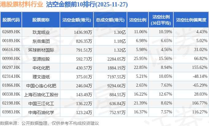 从沽空金额来看,玖龙纸业、东岳集团、环球新材国际沽空金额位居行业前三,分别为1436.99万港元、826.35万港元、791.51万港元。