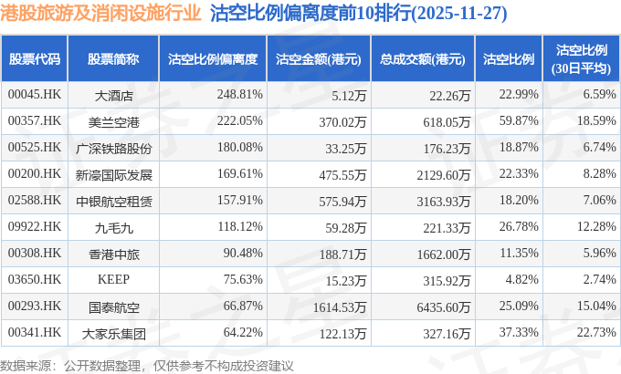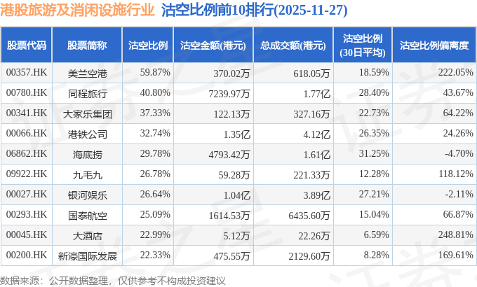 从沽空比例来看,美兰空港、同程旅行、大家乐集团沽空比例位居行业前三,分别为59.87%、40.8%、37.33%。