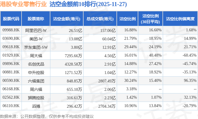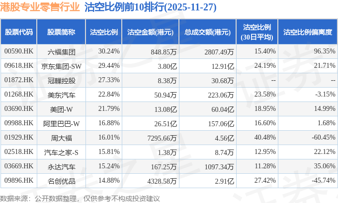 从沽空比例来看,六福集团、京东集团-SW、冠轈控股沽空比例位居行业前三,分别为30.24%、29.44%、27.33%。