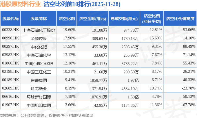 从沽空比例来看,上海石油化工股份、至源控股、中化化肥沽空比例位居行业前三,分别为19.6%、17.9%、17.55%。