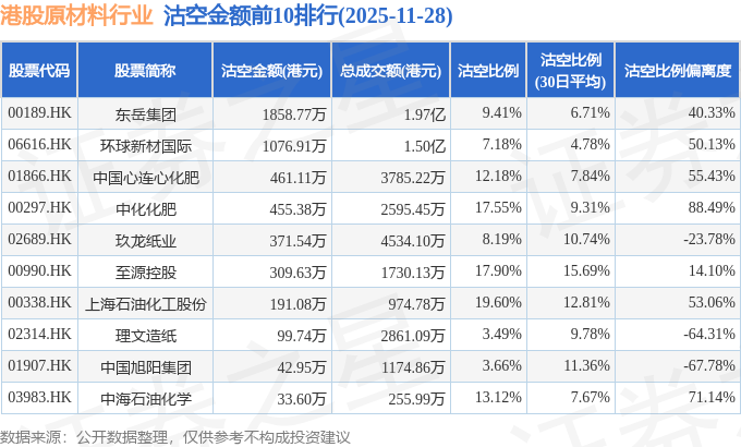 从沽空金额来看,东岳集团、环球新材国际、中国心连心化肥沽空金额位居行业前三,分别为1858.77万港元、1076.91万港元、461.11万港元。