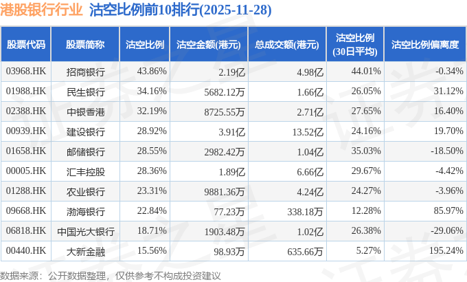 从沽空比例来看,招商银行、民生银行、中银香港沽空比例位居行业前三,分别为43.86%、34.16%、32.19%。