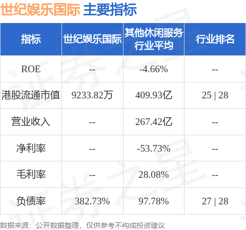 世纪娱乐国际港股市值9233.82万港元,在其他休闲服务行业中排名第25。主要指标见下表: