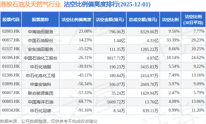 从沽空比例偏离度来看,中海油田服务、中国石油股份、安东油田服务沽空比例偏离度位居行业前三,分别为23.08%、14.23%、-15.52%。