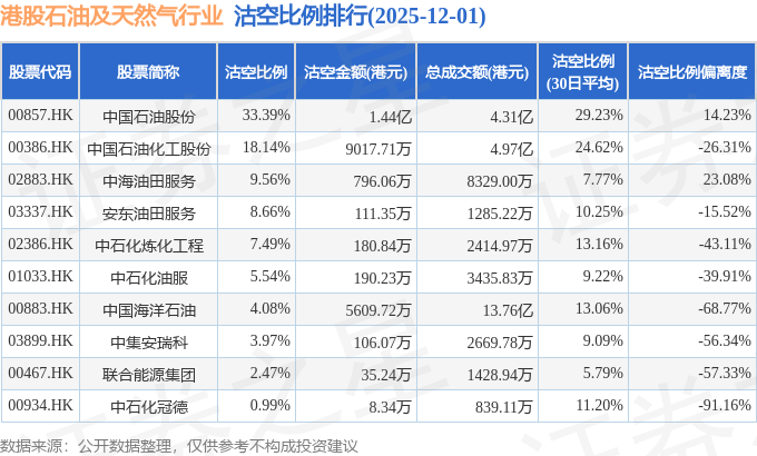从沽空比例来看,中国石油股份、中国石油化工股份、中海油田服务沽空比例位居行业前三,分别为33.39%、18.14%、9.56%。